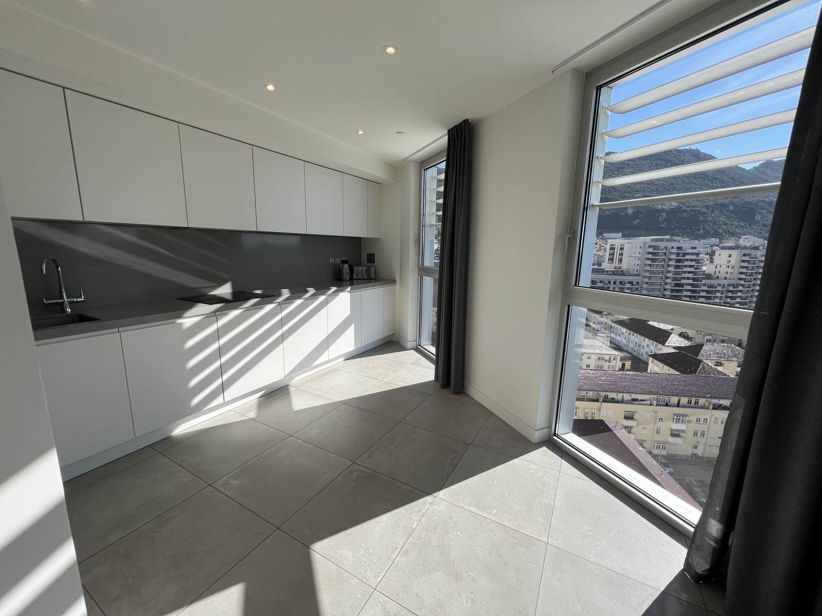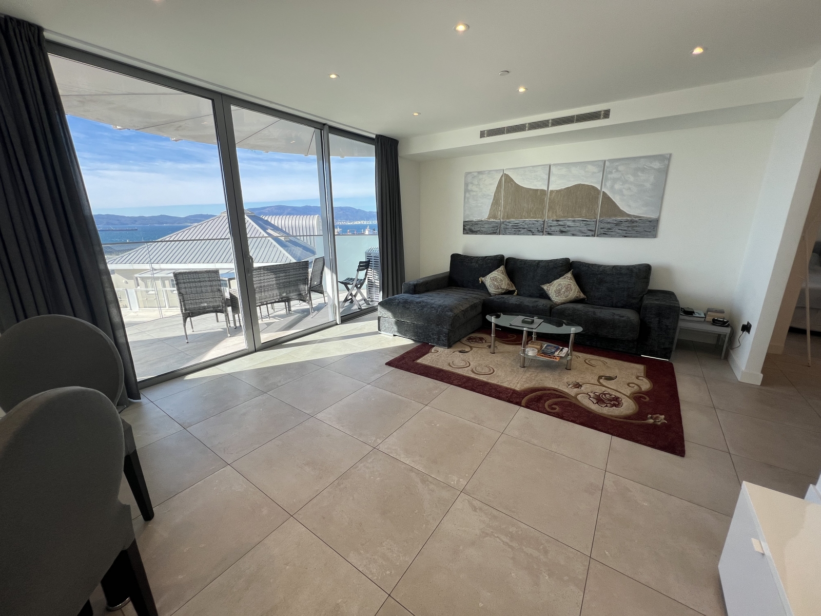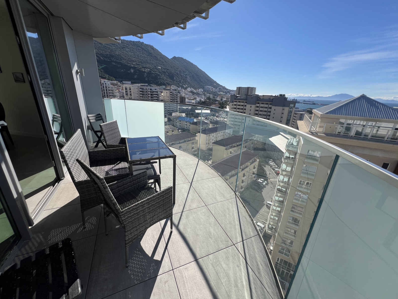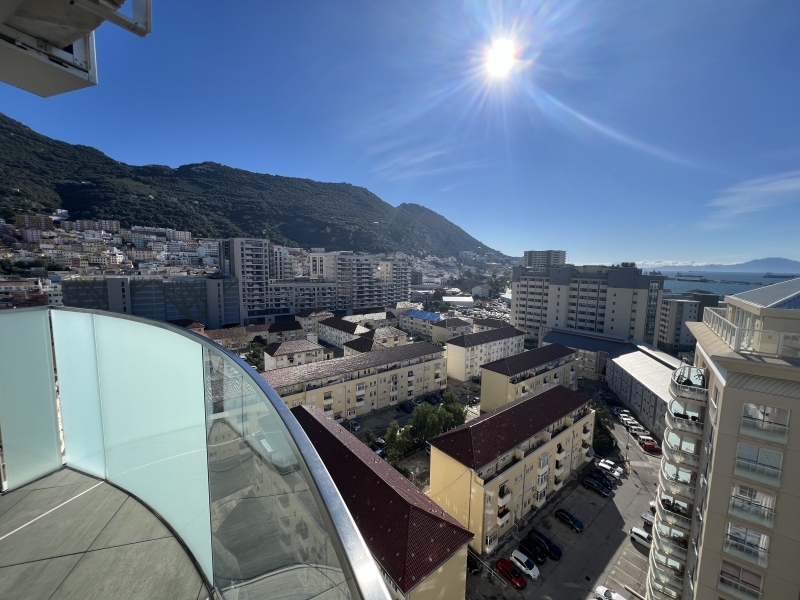 Floor-to-ceiling glazing leads to a sun-drenched, south-facing terrace showcasing impressive Rock and Bay views, ideal for relaxing or hosting guests. A second west-facing terrace, accessed from both the principal and second bedrooms, enhances the sense of space and floods the apartment with natural light throughout the day.