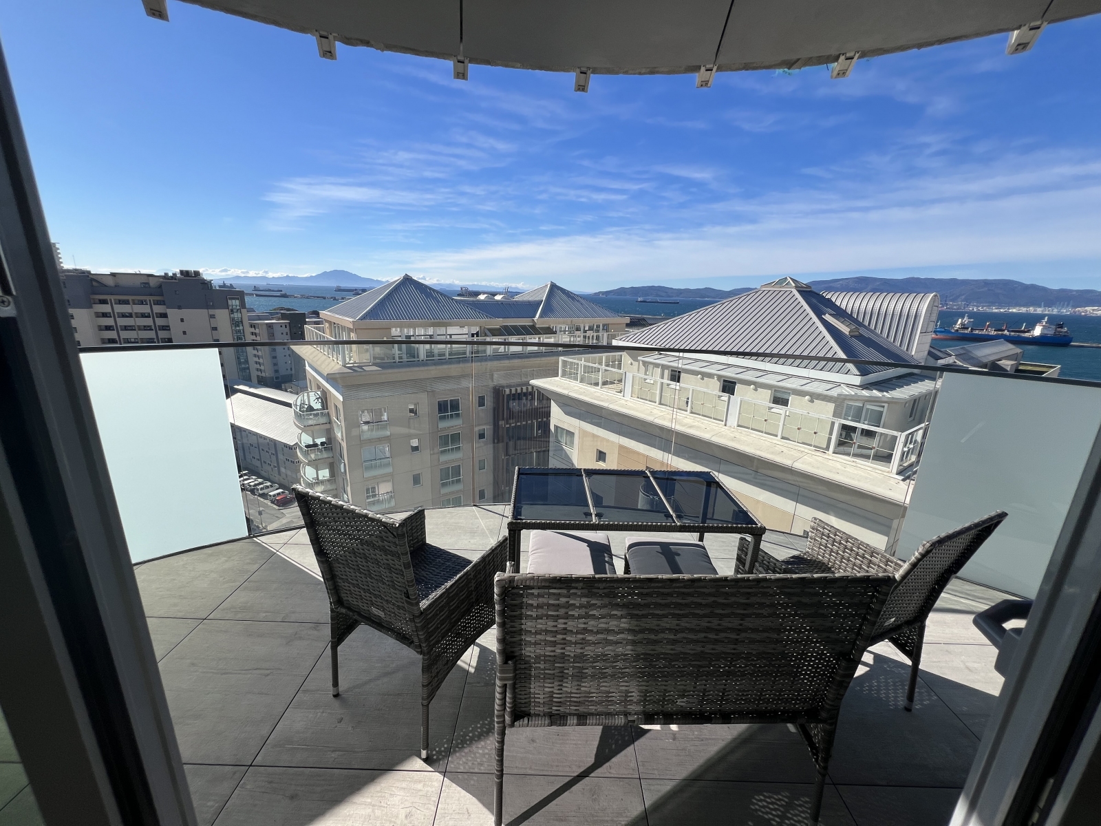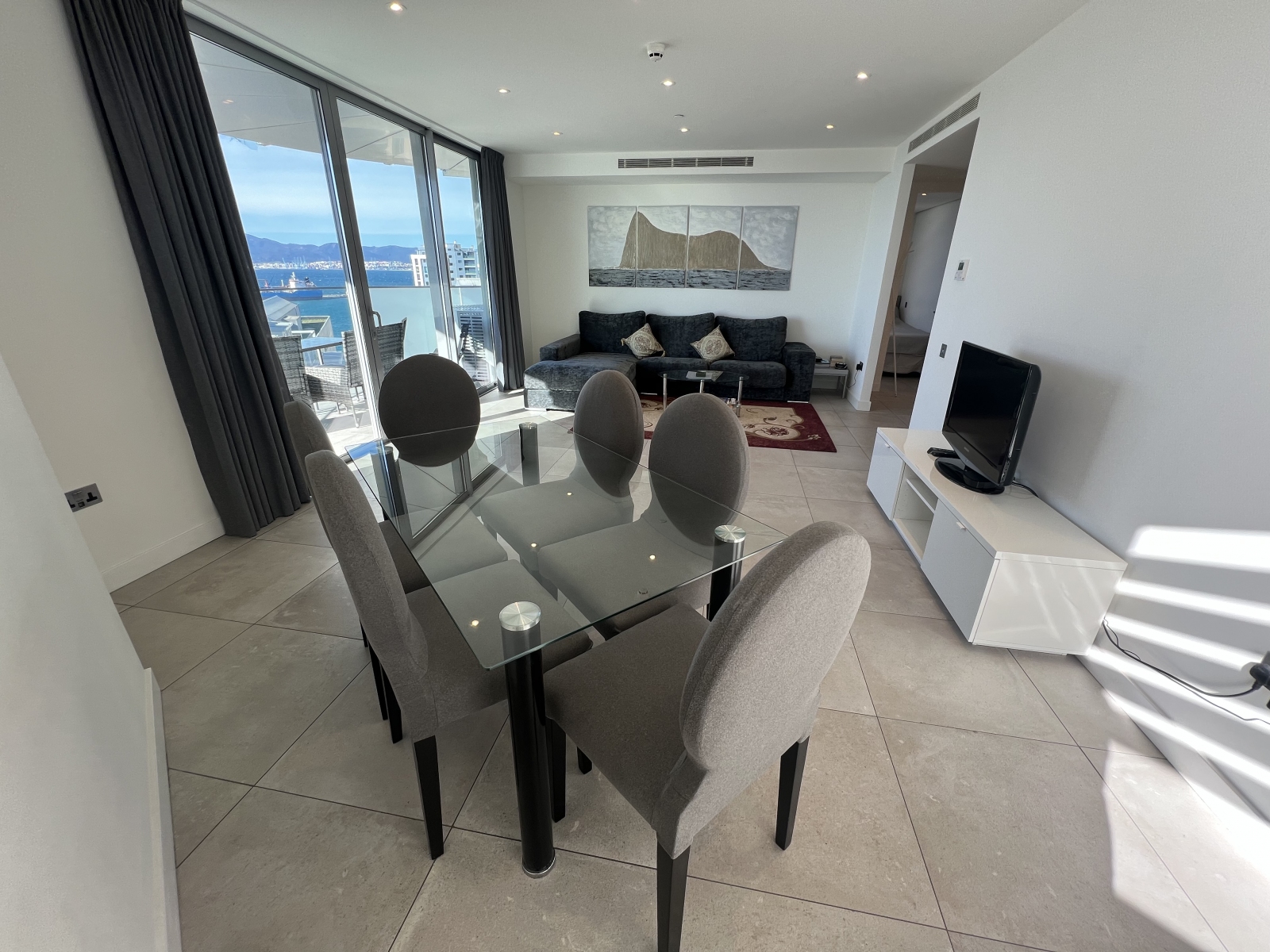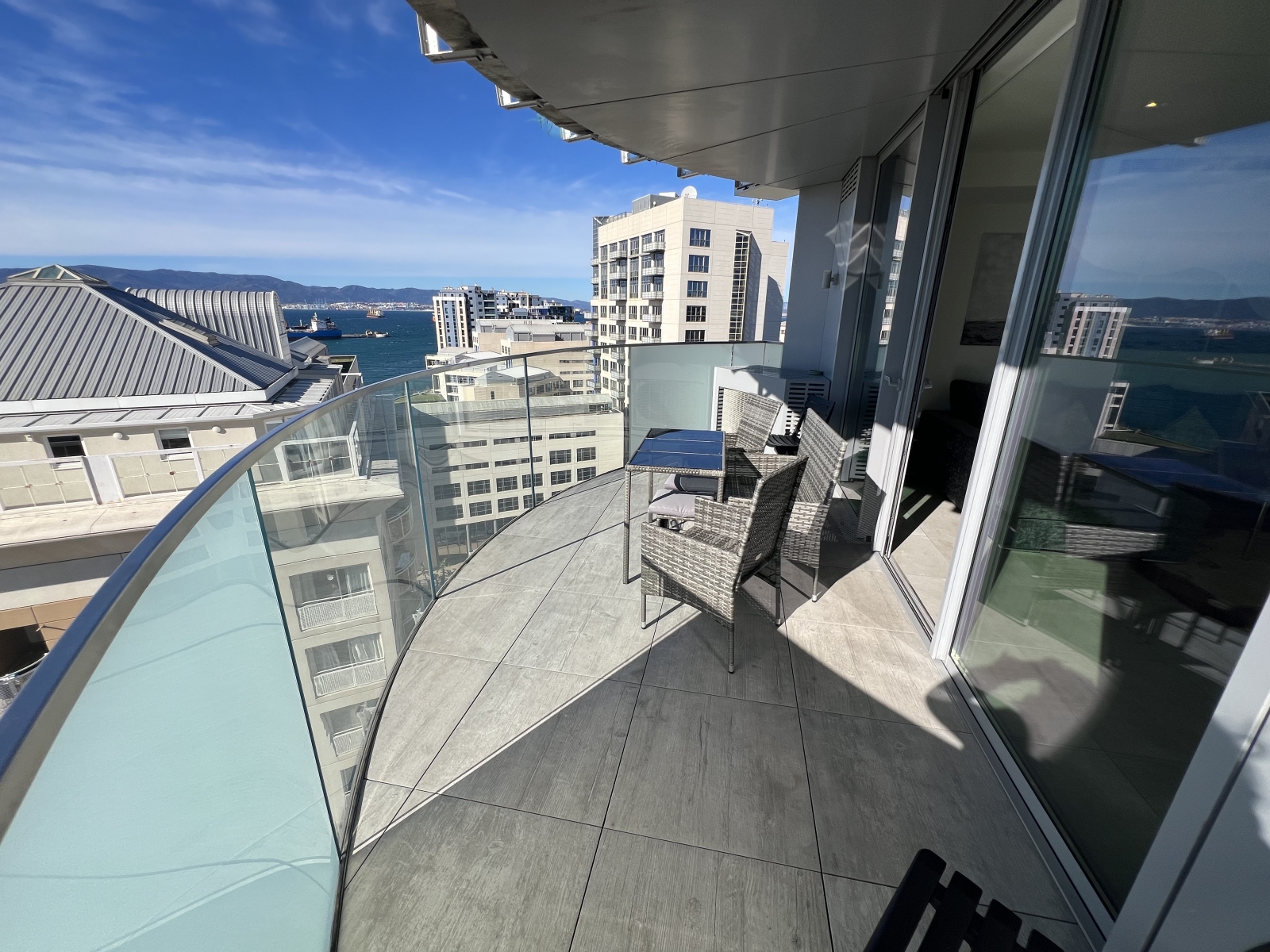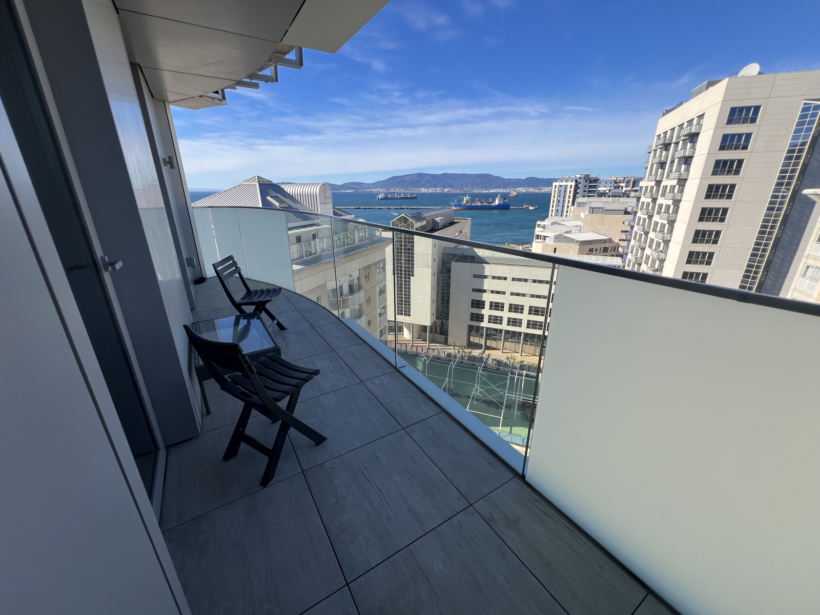 Floor-to-ceiling glazing leads to a sun-drenched, south-facing terrace showcasing impressive Rock and Bay views, ideal for relaxing or hosting guests. A second west-facing terrace, accessed from both the principal and second bedrooms, enhances the sense of space and floods the apartment with natural light throughout the day.