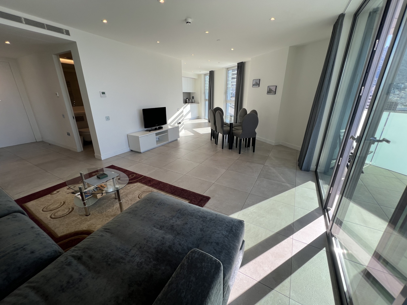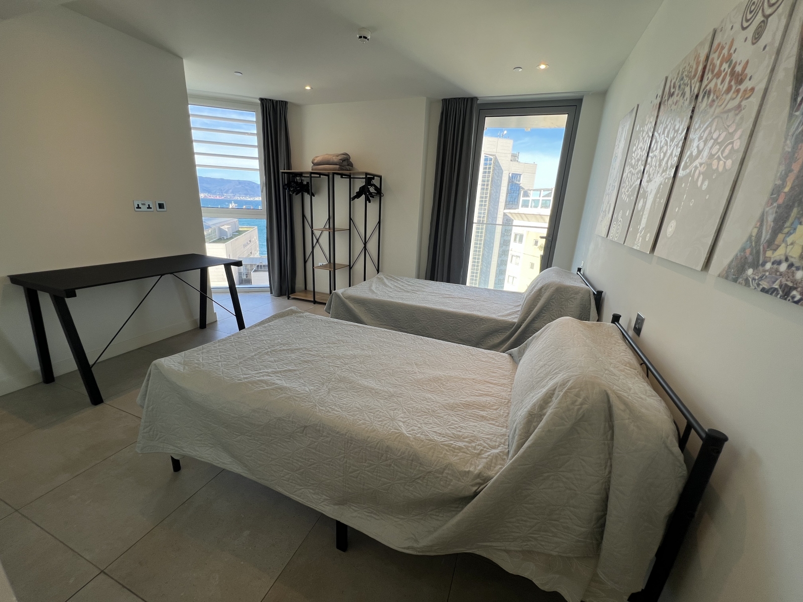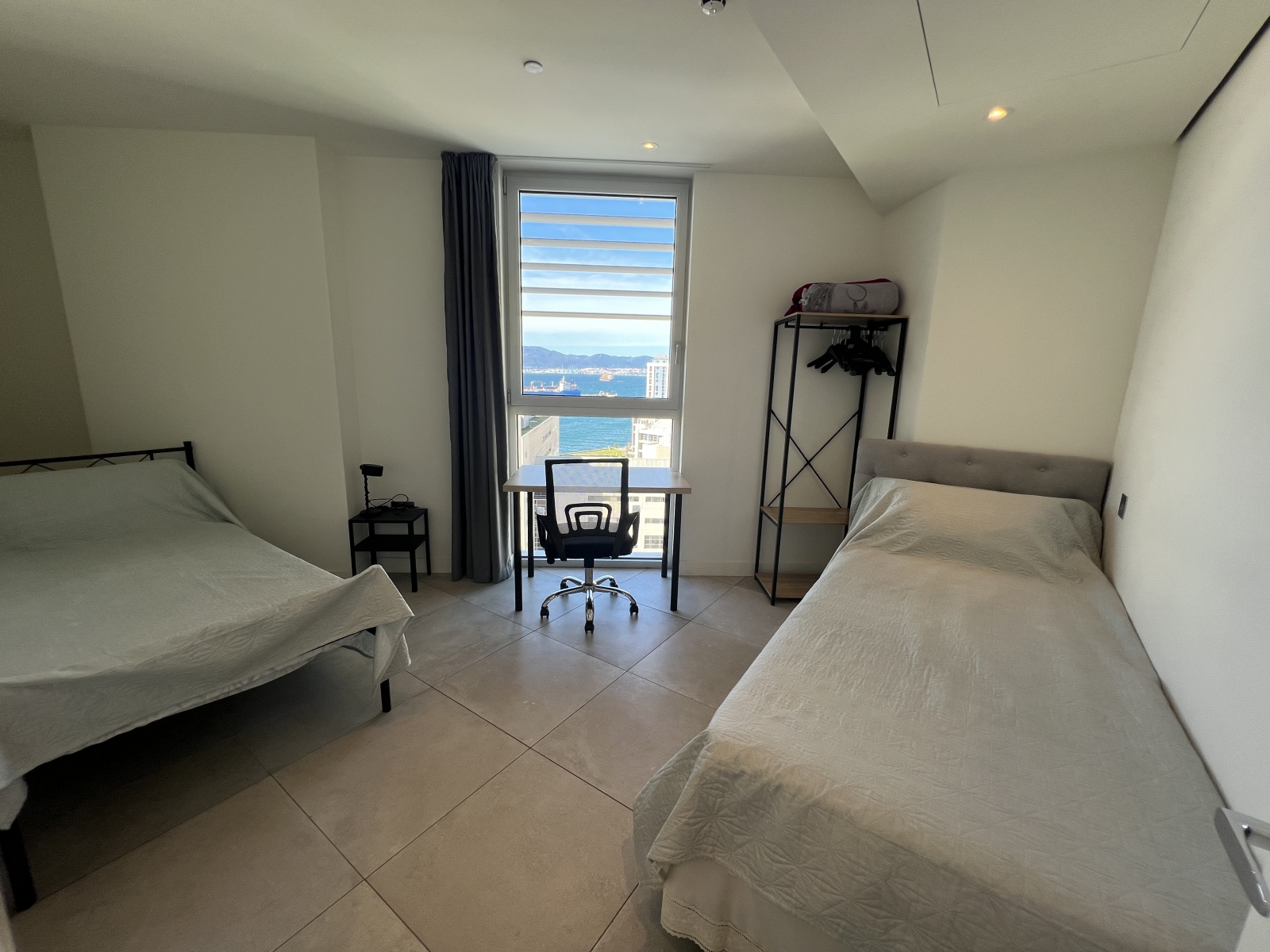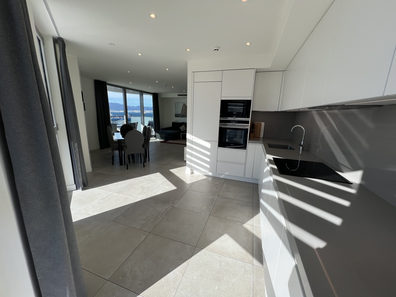 Floor-to-ceiling glazing leads to a sun-drenched, south-facing terrace showcasing impressive Rock and Bay views, ideal for relaxing or hosting guests. A second west-facing terrace, accessed from both the principal and second bedrooms, enhances the sense of space and floods the apartment with natural light throughout the day.