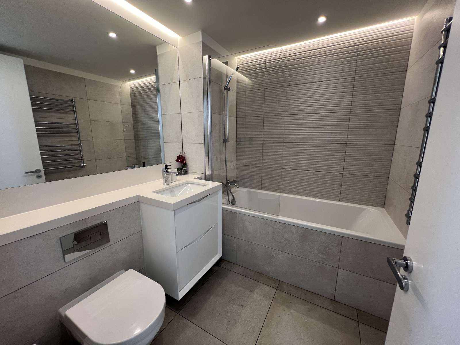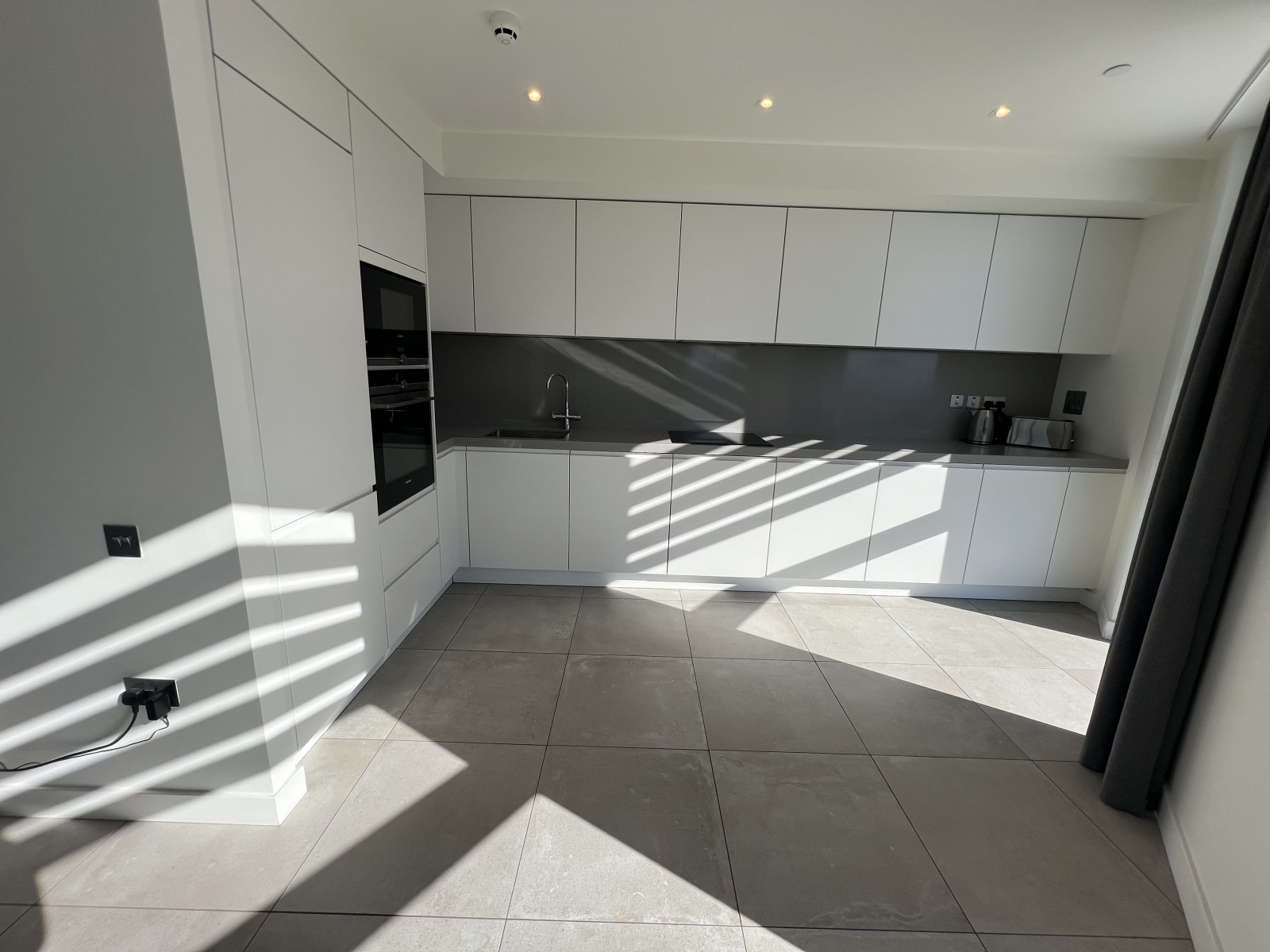 The home features three generous double bedrooms, including a refined principal suite with a stylish en-suite bathroom, complemented by a second sleek, modern bathroom. The heart of the apartment is the expansive open-plan living and dining area, seamlessly integrated with a high-specification, modern kitchen—perfect for both everyday living and entertaining.