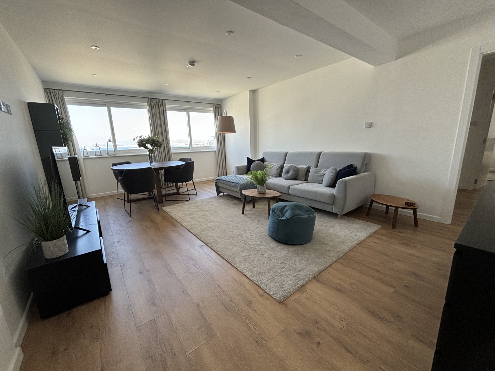 The lounge is tastefully furnished with a contemporary sofa, feature lighting, and a dedicated dining space, making it ideal for both relaxation and entertaining. The sleek, fully fitted kitchen features integrated appliances, ample storage, and a stylish finish with tiled splashbacks and stone-effect flooring.