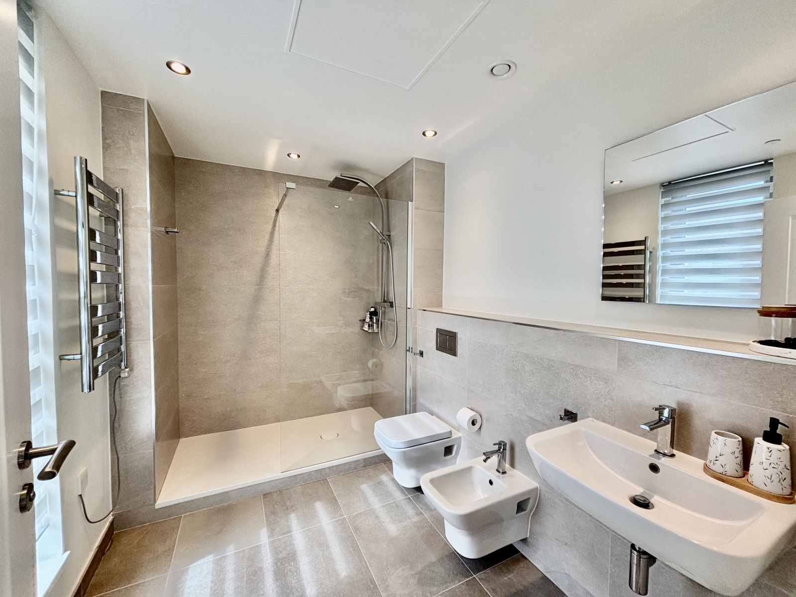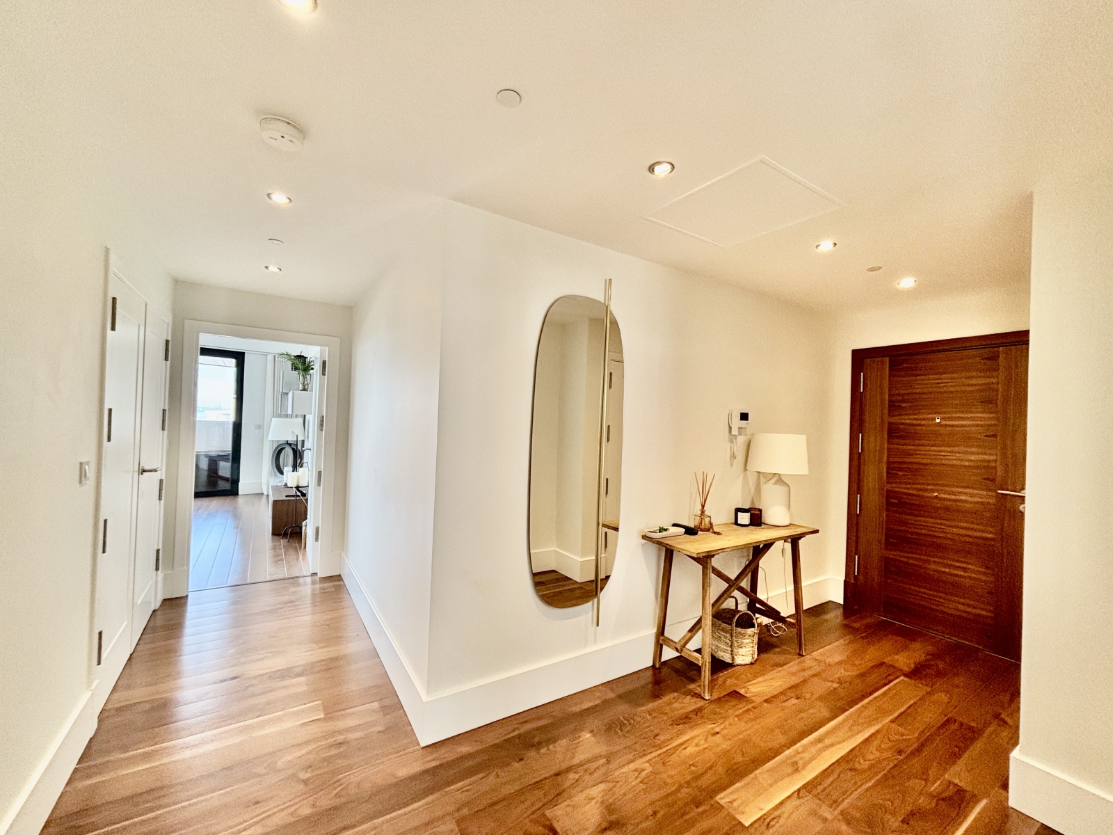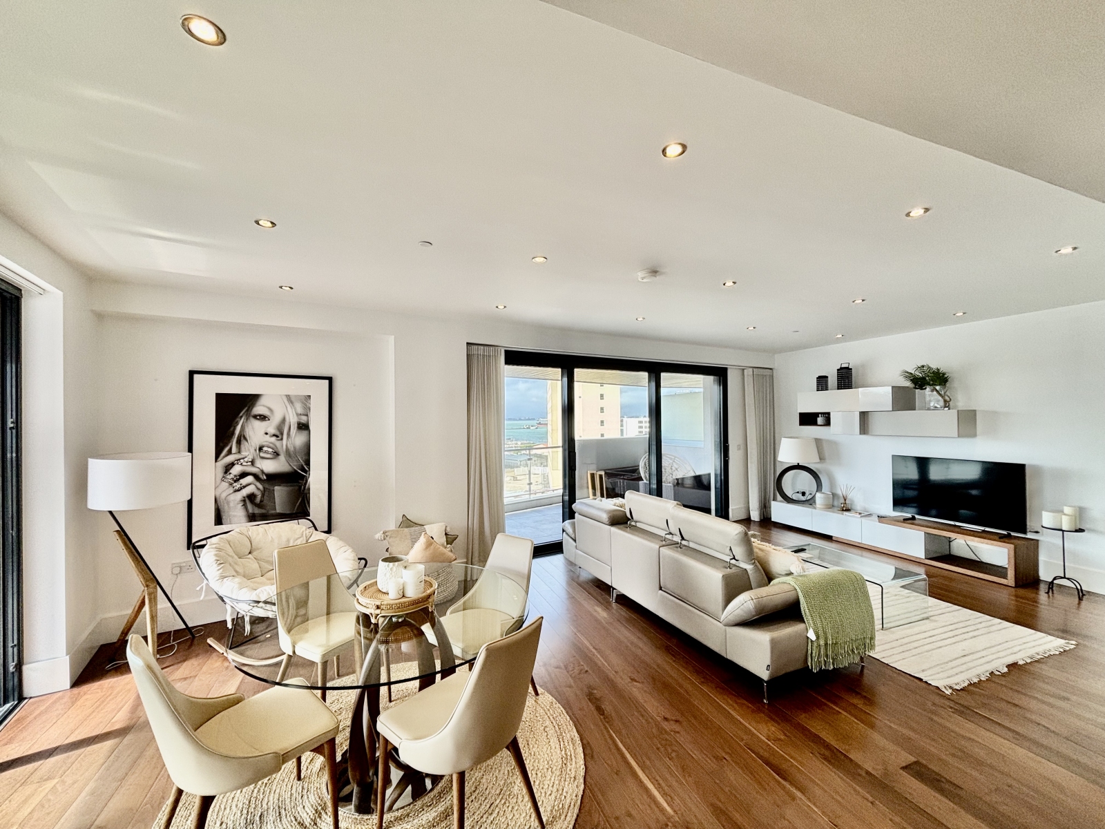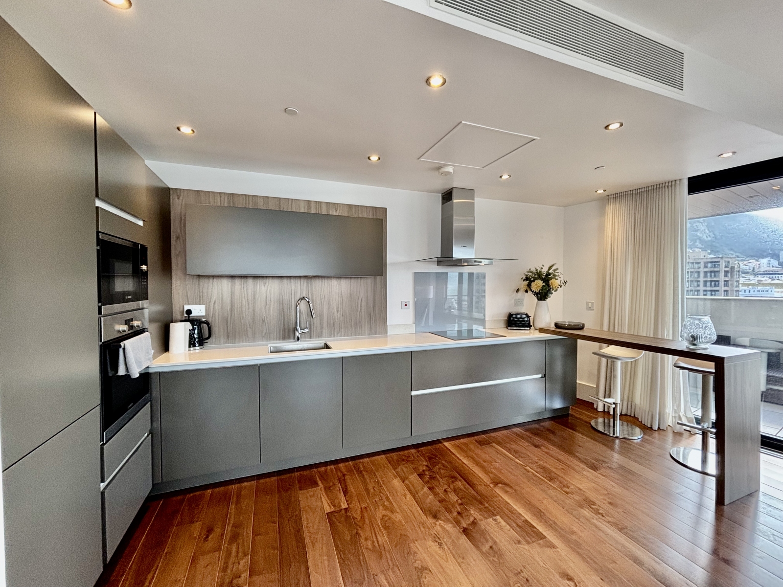 A separate utility cupboard houses the washer/dryer with additional space for laundry storage. The hallway opens onto a spacious living/dining room with an open-plan kitchen and breakfast bar. Floor-to-ceiling sliding glass doors provide abundant natural light and lead onto an impressive 39 sqm wrap-around south-west facing terrace, perfect for outdoor living and entertaining.