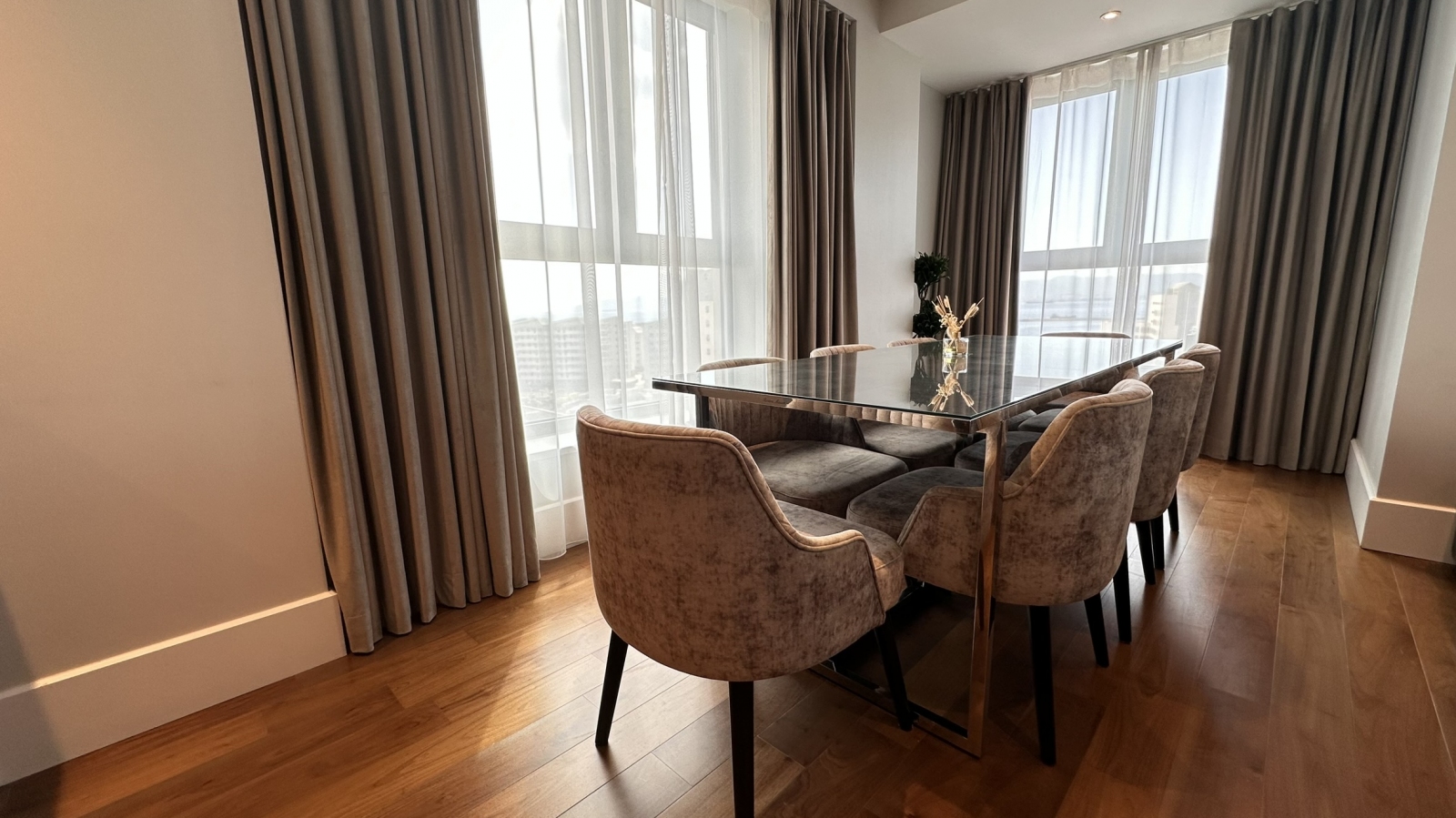 The master bedroom exudes elegance and comfort, offering a spacious layout and an opulent ensuite bathroom. Large windows frame breathtaking bay views, creating a serene retreat.