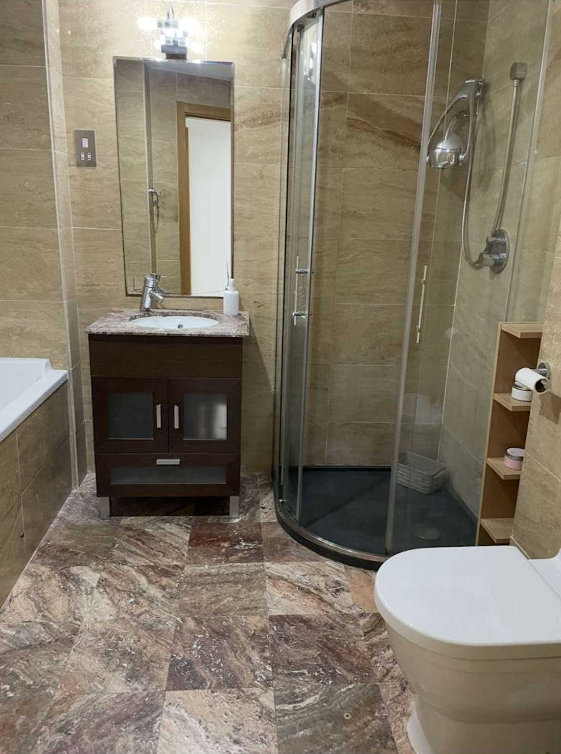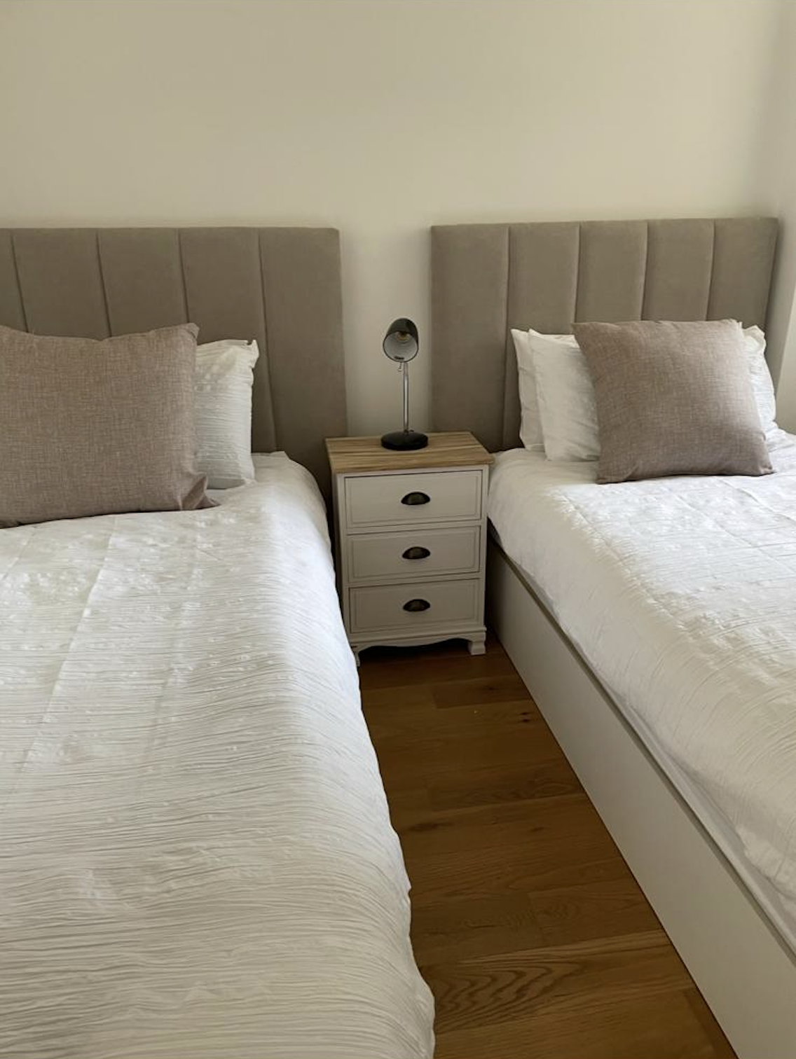 Both double bedrooms are equipped with dives bed bases and fitted wardrobes, with one enjoying direct access to the terrace. The contemporary bathroom includes both a bath and a separate shower for added convenience.
