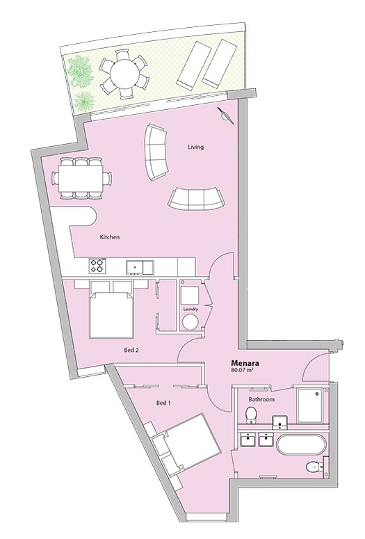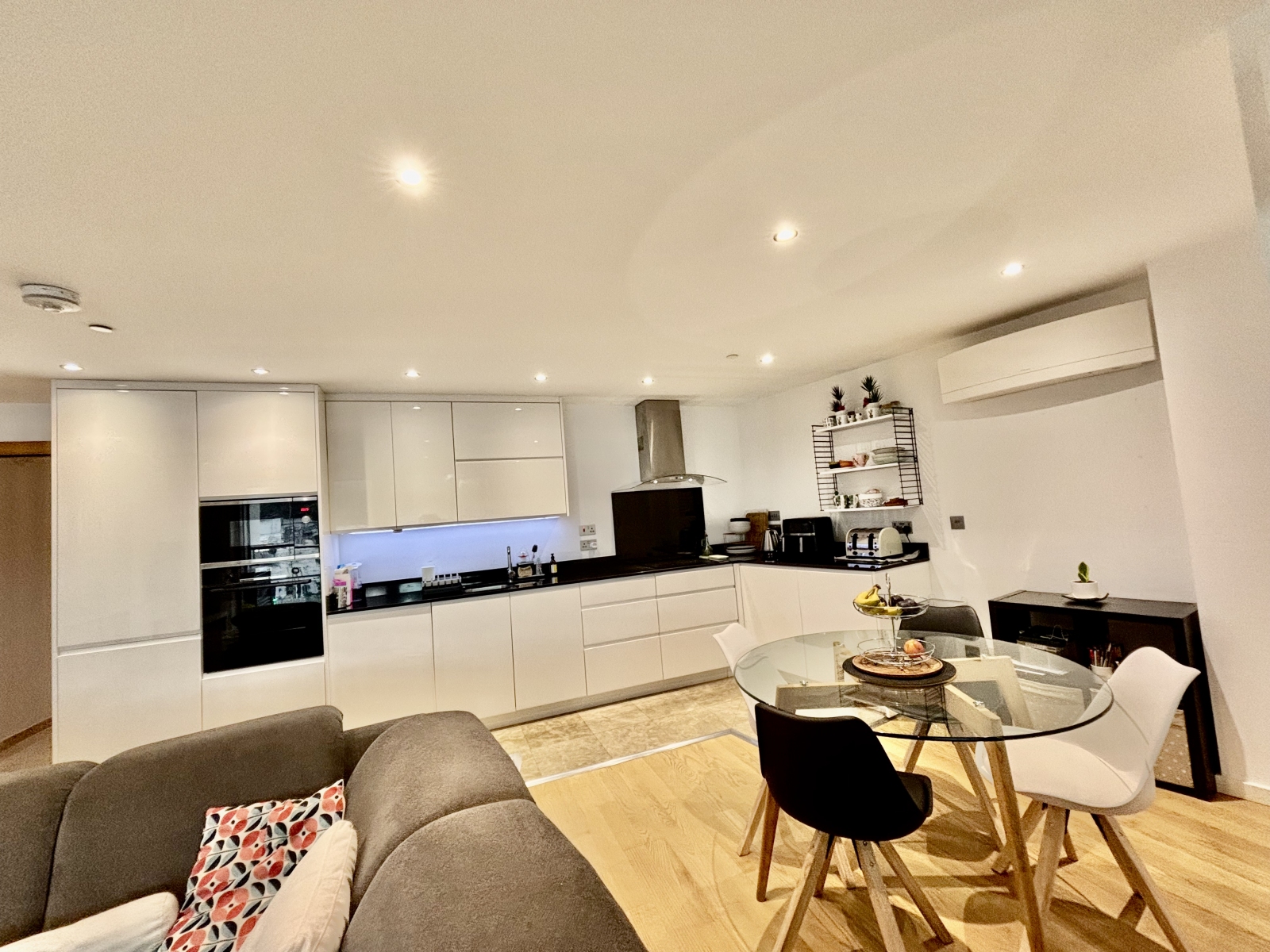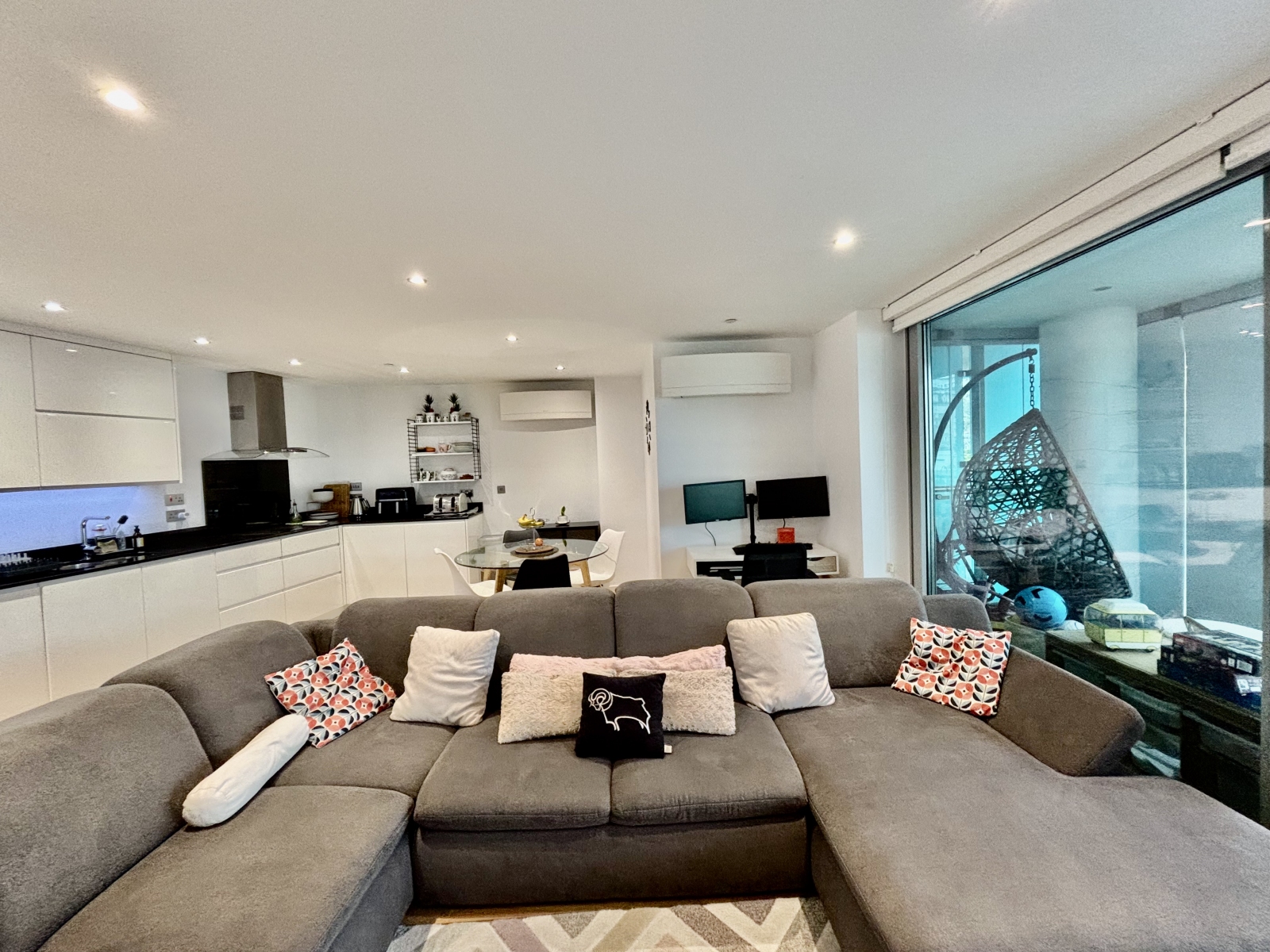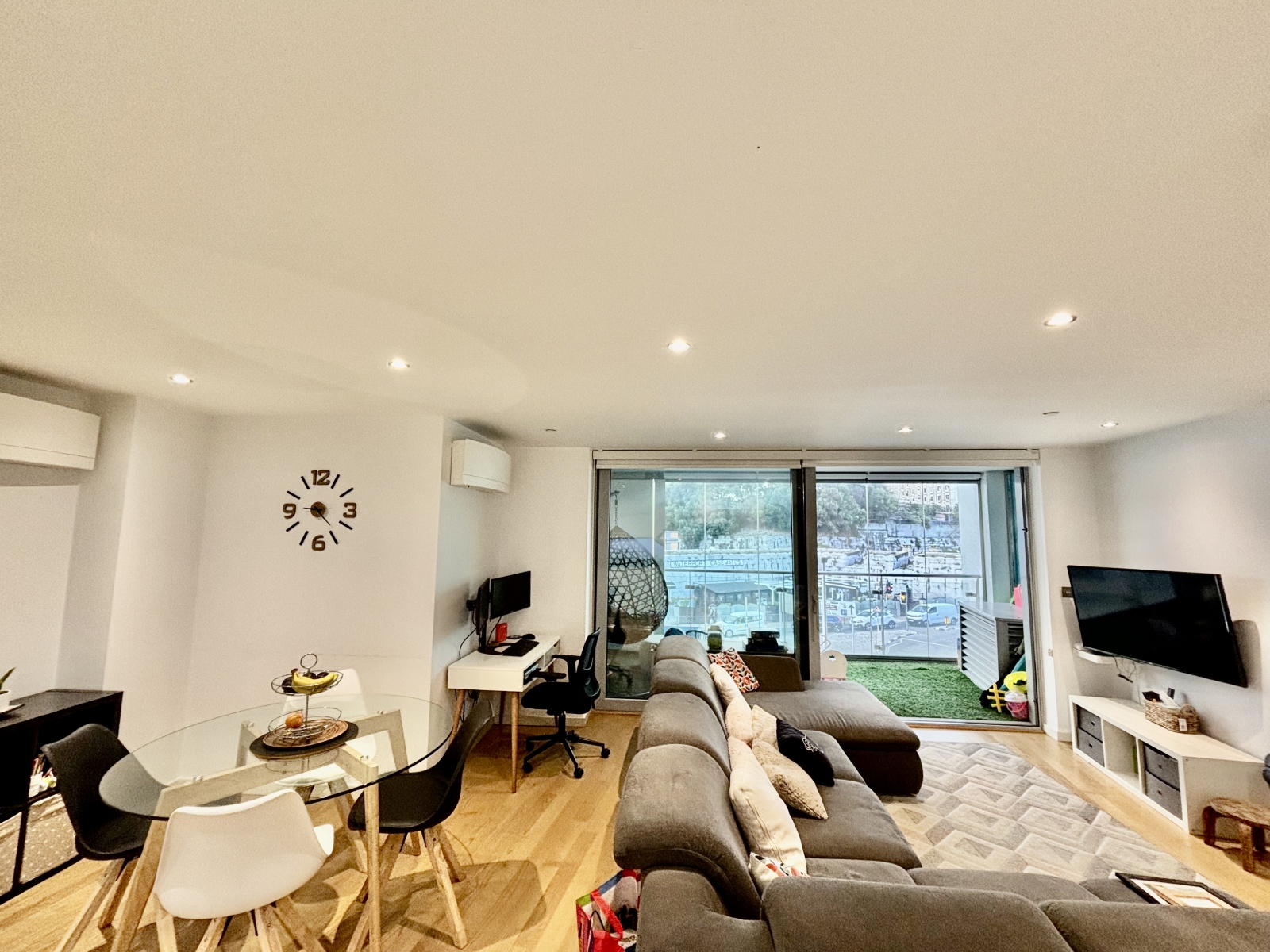 The apartment boasts a spacious open-plan kitchen, living, and dining area, filled with natural light thanks to its bright southerly aspect. Offered partly furnished or unfurnished, this stylish home is perfect for a young family, couple, or professional seeking a centrally located residence just moments from Main Street and within walking distance of the lively bars and restaurants of Ocean Village Marina.