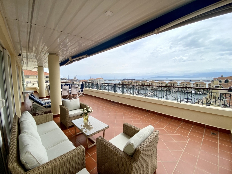 From the moment you enter, you are welcomed by a bright and spacious open-plan living area, beautifully designed to combine elegance and comfort. The seamless flow leads onto an expansive wraparound balcony, where breathtaking views of the Rock of Gibraltar and the Mediterranean Sea create the perfect backdrop for both entertaining and relaxation.
