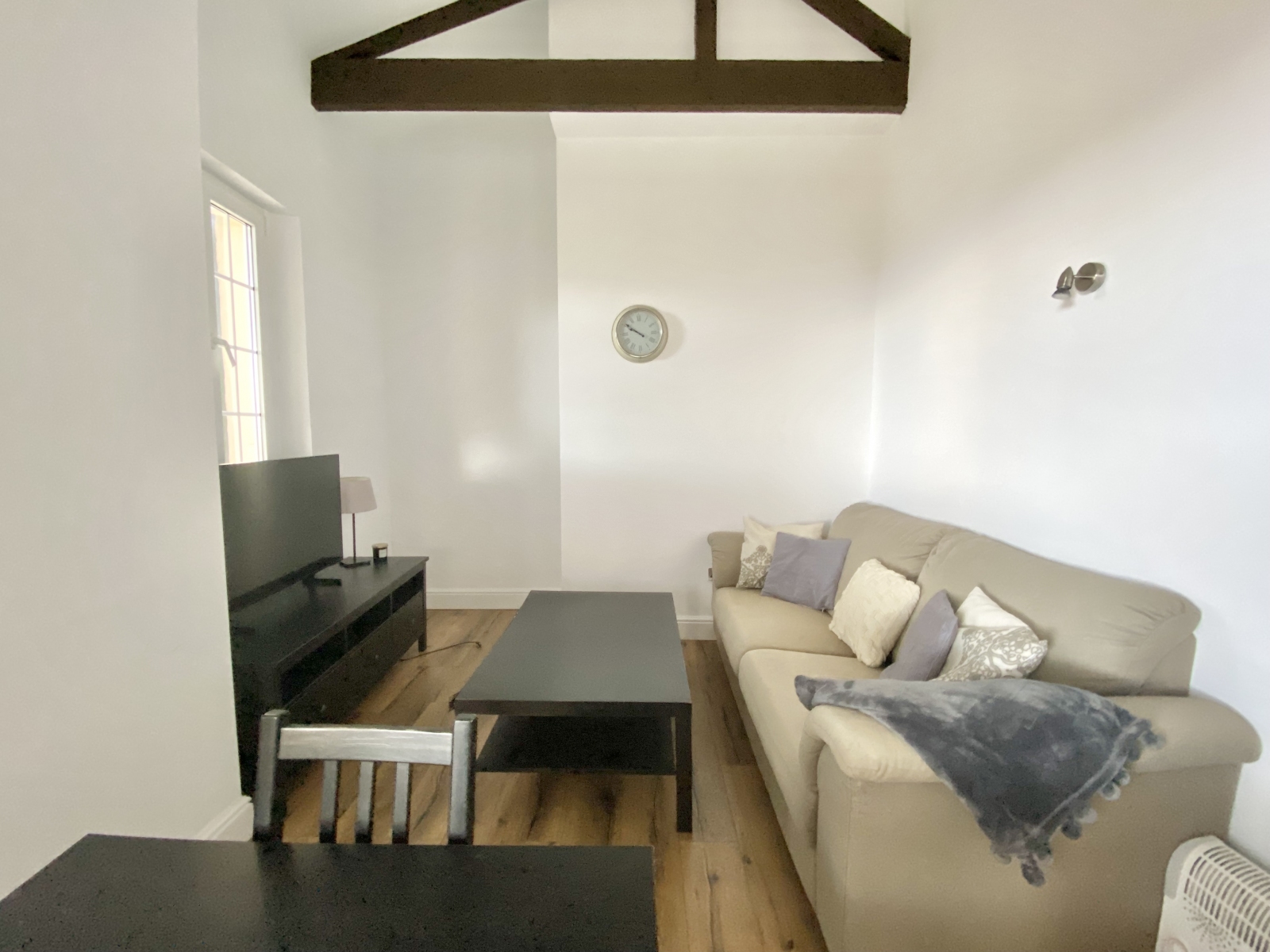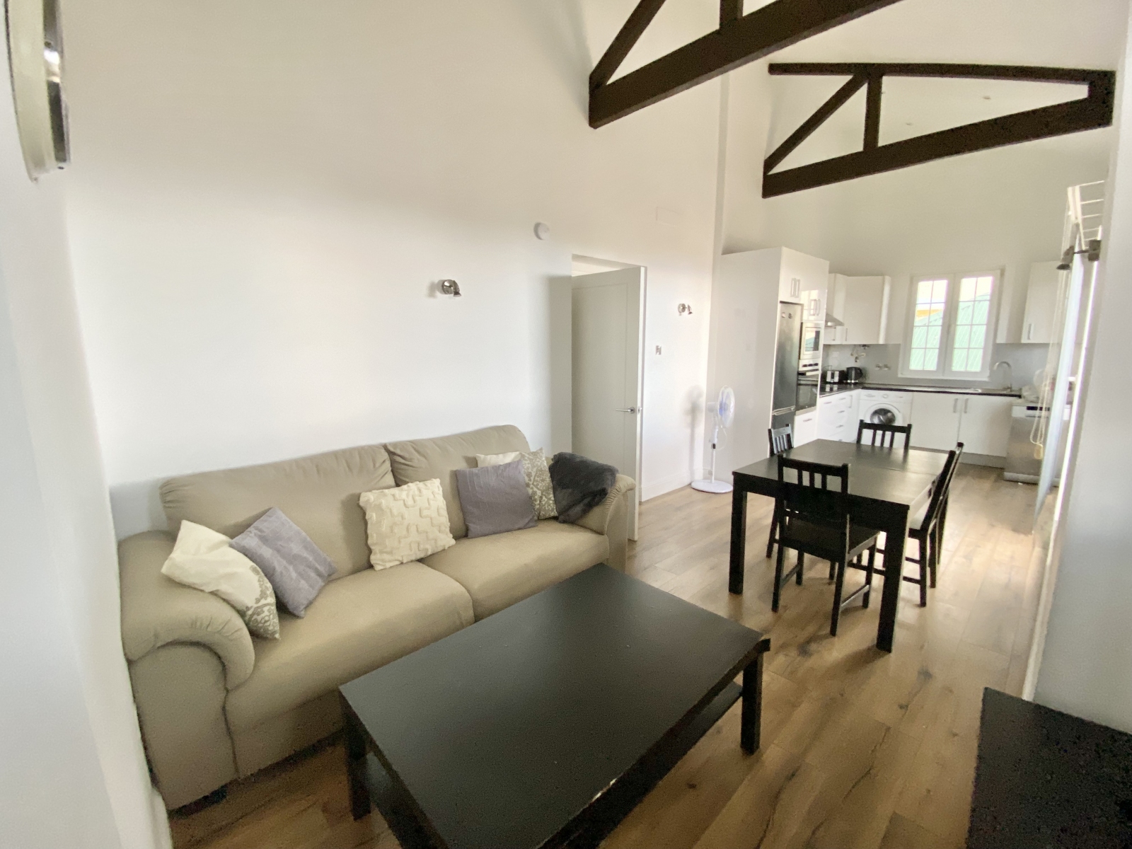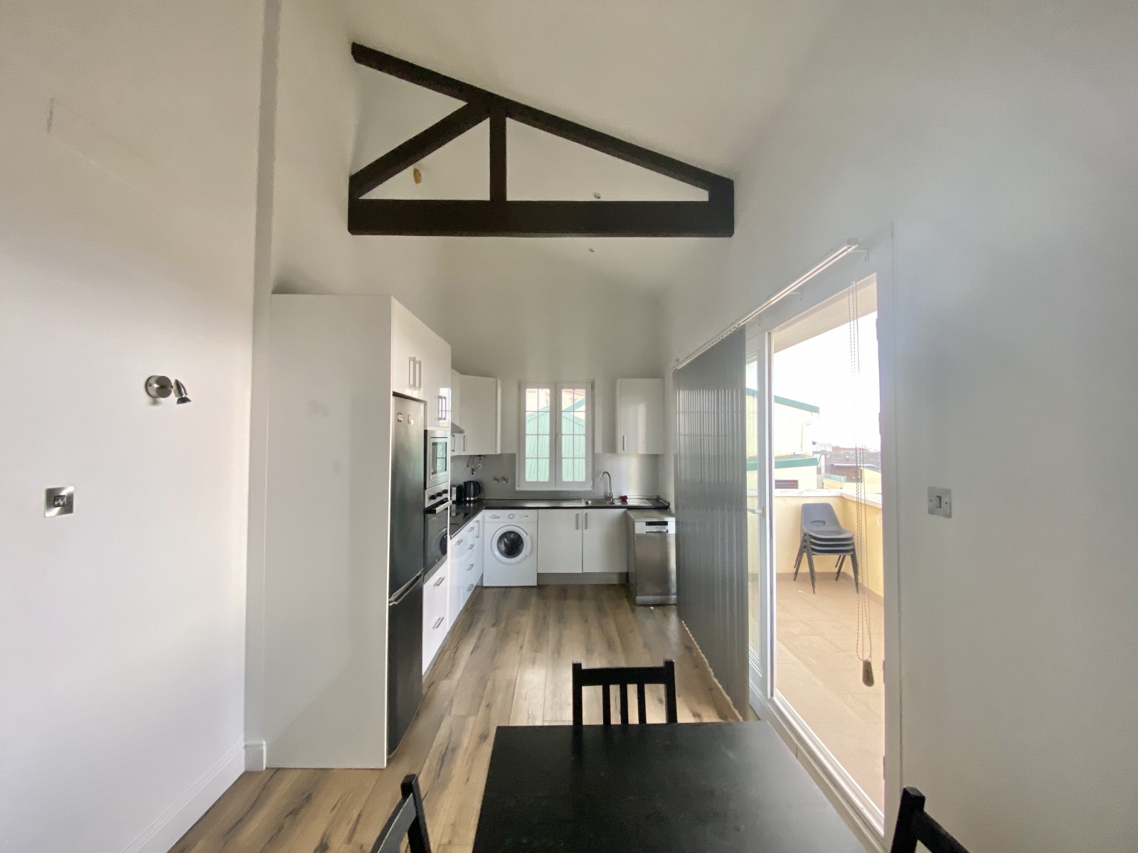 The property features a stylish open-plan living and dining area with high ceilings and exposed beams, seamlessly connected to a fully fitted kitchen with integrated appliances. Large windows and direct access to a private terrace allow for plenty of natural light and the opportunity to enjoy outdoor dining or simply relax while taking in the panoramic views.