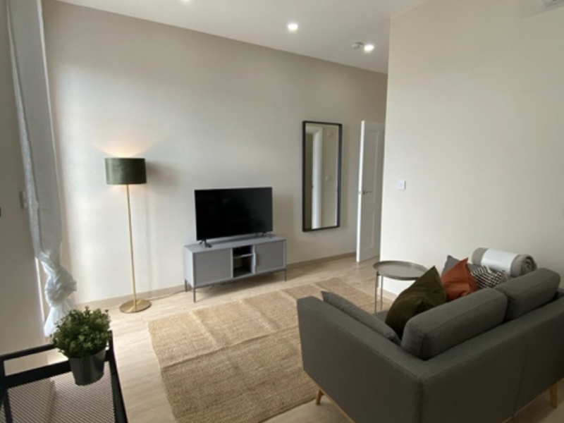 The apartment features a bright and welcoming open-plan living space with contemporary furnishings and a fully fitted kitchen. The lounge area is thoughtfully designed with a cosy sofa and vibrant accents, ideal for relaxing or entertaining.