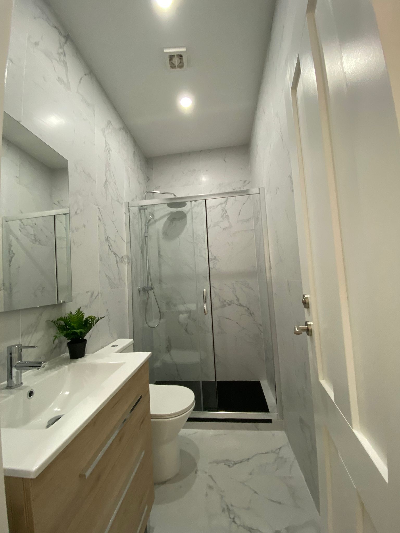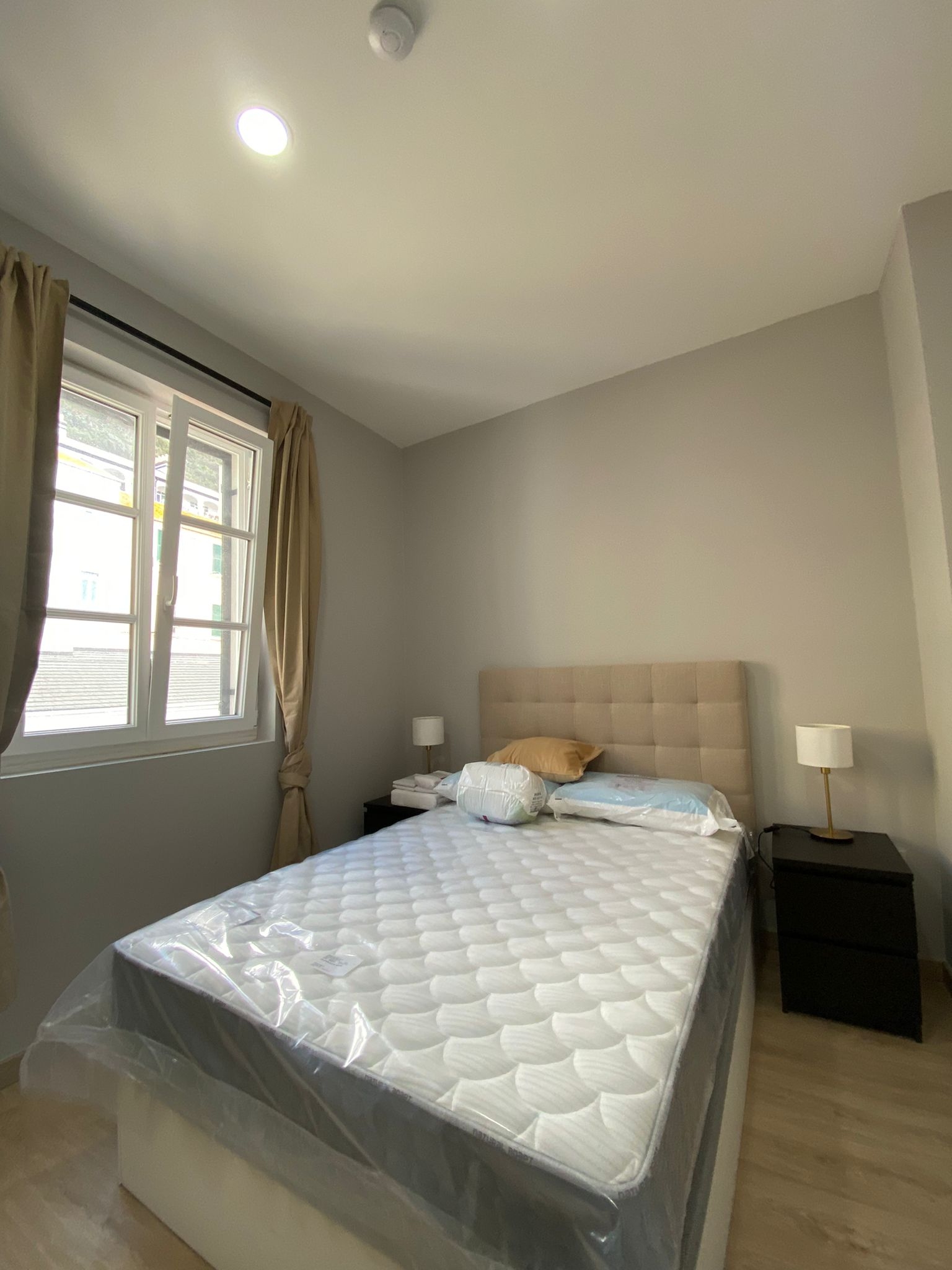 The spacious double bedroom includes ample wardrobe space and is flooded with natural light through traditional-style windows. The modern bathroom is finished to a high standard, complete with marble-effect tiling, a walk-in shower, and quality fixtures.
