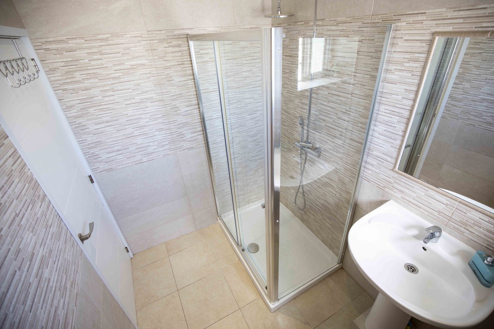 The kitchen and dining space offer flexibility in layout — ideal for those who prefer an open-plan design or wish to keep distinct cooking and dining areas. On the lower level, three double bedrooms (one en-suite) open out to a charming patio area with a covered section, offering a shaded spot to unwind.