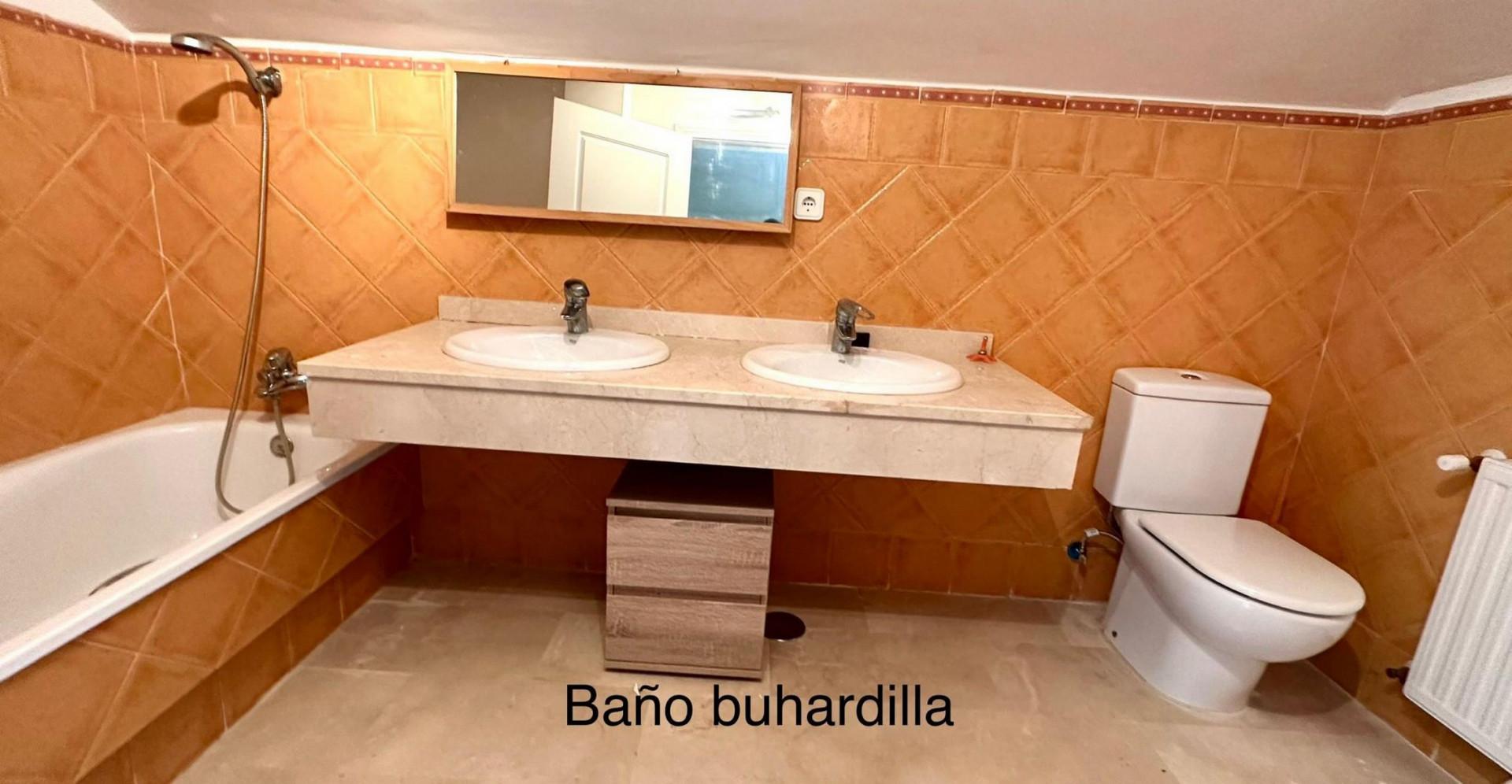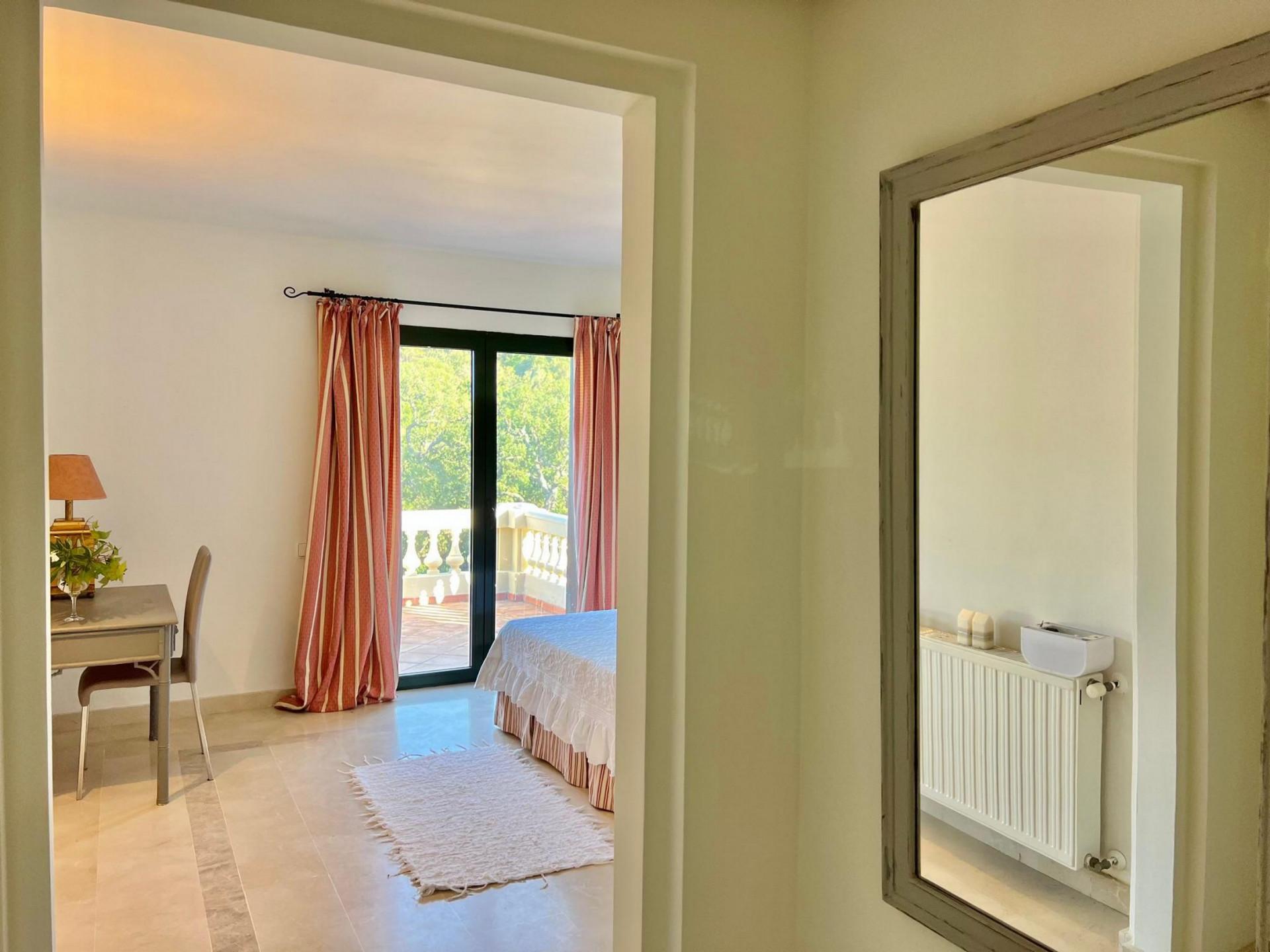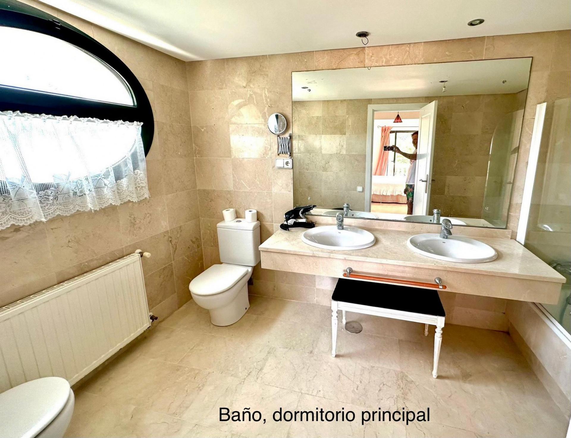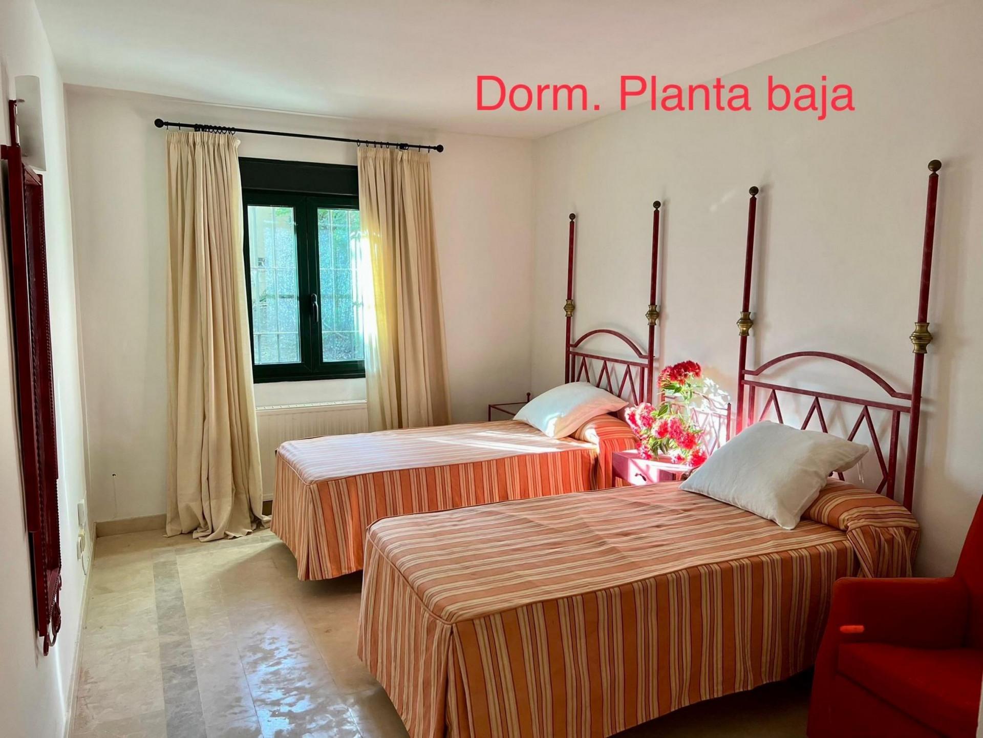 This semi-detached house is situated at number eight within the Sotogolf urbanization. It boasts a generous 2000 square meter plot and a spacious 480 square meters of built area, comprising five bedrooms and four bathrooms. On the first floor, you'll find the entrance hall, a spacious living room, a well-appointed kitchen, a bedroom, and a bathroom, along with a charming porch offering access to the garden. Ascending to the second floor, you'll discover three bedrooms accompanied by two bathrooms, including the master bedroom with an en suite bathroom. The master bedroom features a king-size bed measuring 2 meters wide, while another bedroom offers two beds measuring 1.35 cm each, and the third bedroom has two beds measuring 90 cm each. The master bedroom and one additional bedroom share a terrace overlooking the scenic cork oak forest, facing east, while the third bedroom enjoys its own terrace facing west. The attic space presents another bedroom equipped with a trundle bed and an additional 90 cm bed, along with a double bathroom. The garage provides ample space for four cars, along with a designated children's playroom. Just a minute's stroll from the house, residents can access the urbanization's swimming pool and paddle tennis court, ensuring leisure and recreational amenities are close at hand.